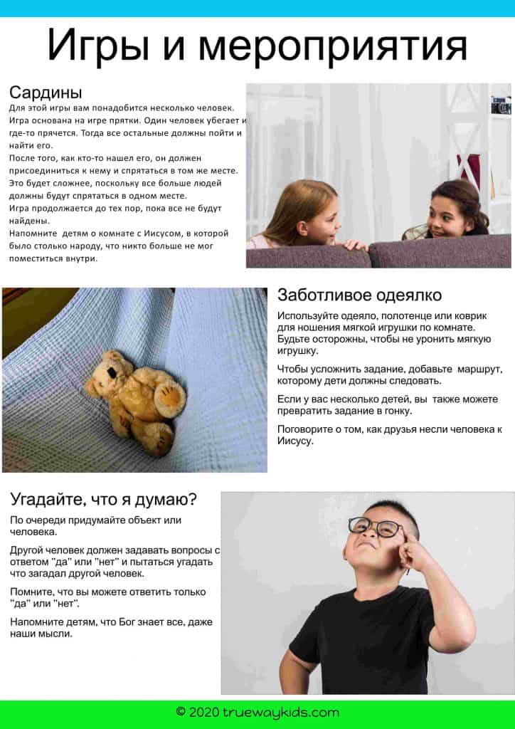 Поговорите о том, что Иисус знает все. Попросите ребенка сказать о чем вы думаете. Позвольте им угадать, но не подсказывайте. Продолжайте играть по очереди отгадывая мысли друг друга. Объясните, что мы можем отгадывать или догадываться что думают другие люди, но Иисус всегда все знает. Поговорите о том, что если кто-то скажет о чем он думал, он может сказать неправду. Как же удивительно, что Иисус всегда знает наши мысли.
