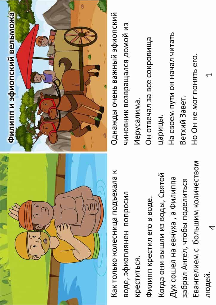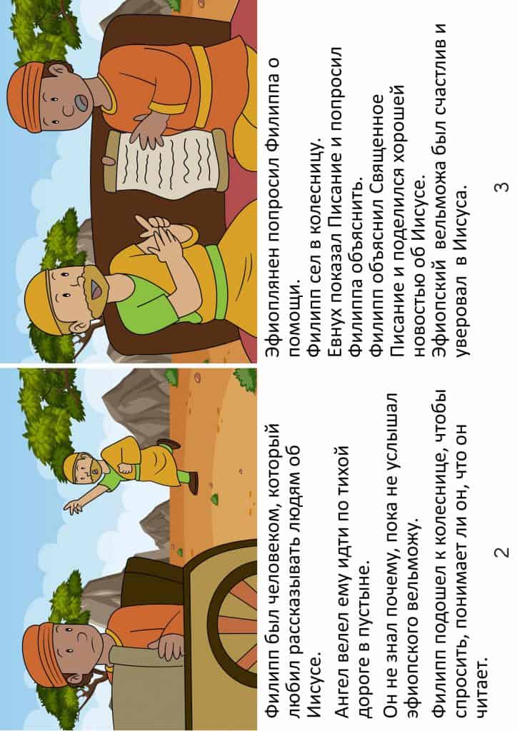 Напомните ребенку, что Филипп был уважаемым и верным человеком. Он был одним из первых семи дьяконов, избранных для помощи апостолам. Филипп начал служение с раздачи еды для вдов, но позже делился Евангелием в Самарии, где многие уверовали в Иисуса. Затем Бог повел его на тихую пустынную дорогу. Поговорите о том, как мы должны служить Богу там, куда Бы Он ни привел нас.