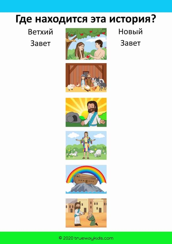 Спросите своего ребенка, помнят ли они две части Библии. Одна часть называется Ветхим Заветом, а другая – Новым Заветом. Спросите ребенка, кого он считает самым важным человеком в Библии. Поговорите о том, как Иисус является путем спасения и центром Библии. Без Него мы не можем быть спасены от наших грехов. Назовите некоторые библейские истории. Спросите ребенка, может ли он сказать вам, находятся ли они в Ветхом или Новом Заветах.