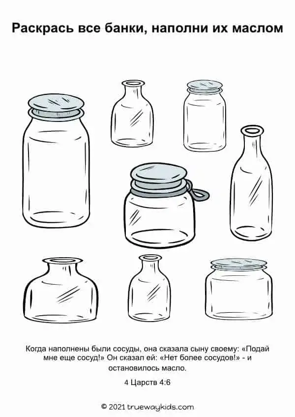 Прочитайте рассказ о Елисее и о масле вдовы из 4 Царств 4:1-7. Капните немного оливкового масла в руку вашего ребенка, чтобы он почувствовал и понюхал его. Объясните, как масло было очень ценным в библейские времена. Соберите разные емкости которые найдете дома и возьмите кувшин с водой. Попробуйте угадать, сколько емкостей вы можете заполнить, прежде чем кувшин опустеет. Помогите ребенку заполнить контейнеры. Поделитесь тем, как Бог совершил чудо, масло в кувшине не заканчивалось.