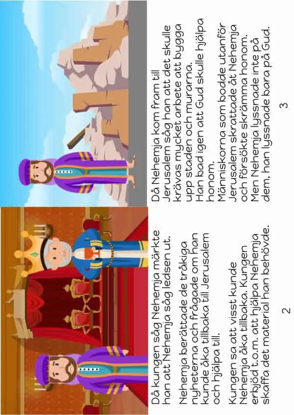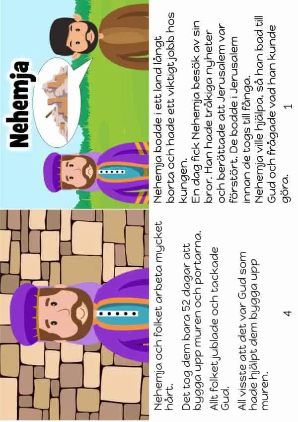 Berätta att Nehemja inte lät sig bli nedslagen och hindras av andra att göra det som var rätt. Fundera tillsammans att ibland kan någon annan försöka få oss att göra det som är dåligt, eller att vi låter bli att göra det som är rätt. Men vi ska följa det som Gud säger i bibeln.