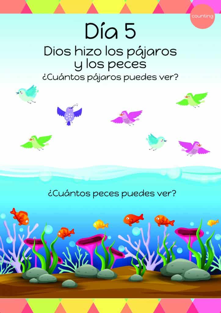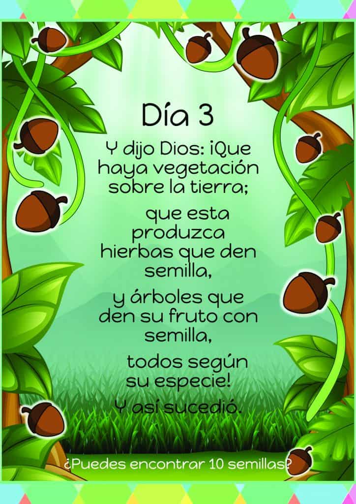 Si es posible, reúna una pequeña colección de macetas llenas de tierra y una selección de semillas. Además, puede reunir una pequeña colección de frutas o verduras con semillas visibles: fresas, moras, tomates, etc. Hable sobre cómo si toma una semilla de un tomate y la planta, siempre sembrará un tomate. Lo mismo con las otras plantas. También puede optar por plantar algunas semillas con su hijo. Celebre que Dios creó un mundo maravilloso y ordenado para nosotros. Usted puede elegir aprender una canción con su hijo celebrando a Dios, como «Mi Dios es tan grande».