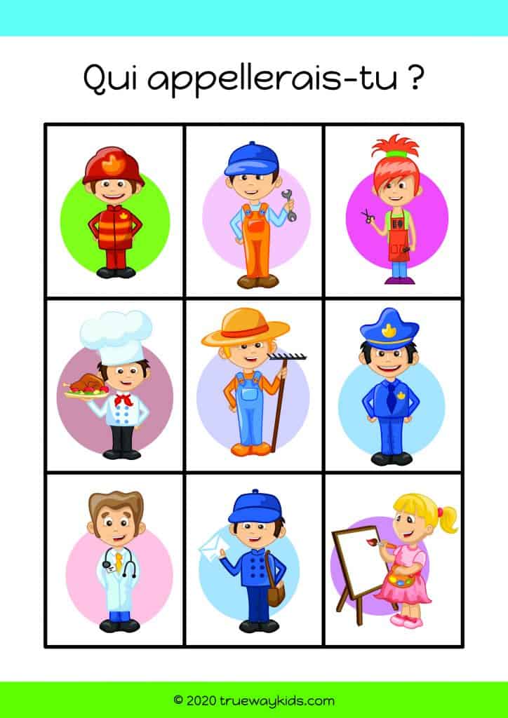 Placez les cartes de la page suivante sur la table. Posez à votre enfant une question du genre : « Qui appellerais-je si j’étais malade? » ou « Qui appellerais-je si je voyais un incendie? »