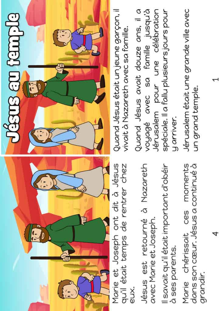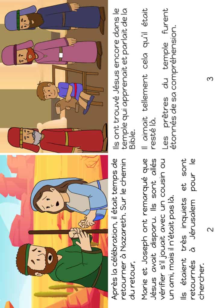 Parlez de la façon dont Marie et Joseph cherchaient Jésus partout, et qu’ils l’ont trouvé dans le temple, enseignant aux enseignants. Expliquez que même s’il était jeune, il aimait la Bible et voulait en parler avec les autres. Dites à votre enfant combien vous aimez qu’il partage ce qu’il a appris de la Bible avec vous.Expliquez que Jésus est rentré chez lui avec Marie et Joseph. Jésus savait combien il était important d’obéir à ses parents.