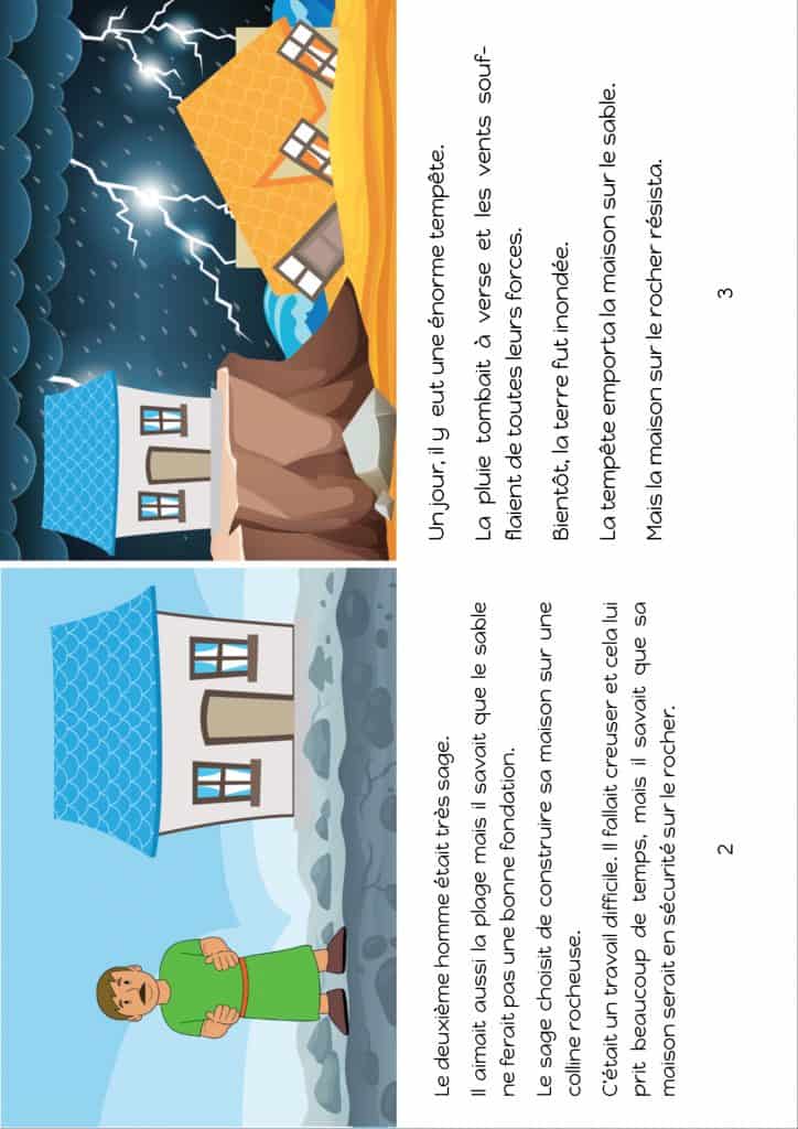 Montrez comment la tempête a frappé la maison du sage et celle de l’insensé. Rappelez à votre enfant que même si nous faisons confiance à Jésus et lui obéissons, nous aurons des jours difficiles. Cependant, en lui faisant confiance et en obéissant à ses paroles, nous resterons toujours en sécurité avec Dieu et prêts pour la tempête.