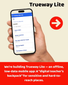 Trueway Lite is being built as an offline-first, low-data, mobile web app: a “digital teacher’s backpack” that makes it possible to teach without carrying stacks of paper, without streaming large files, and with far less risk in sensitive regions.