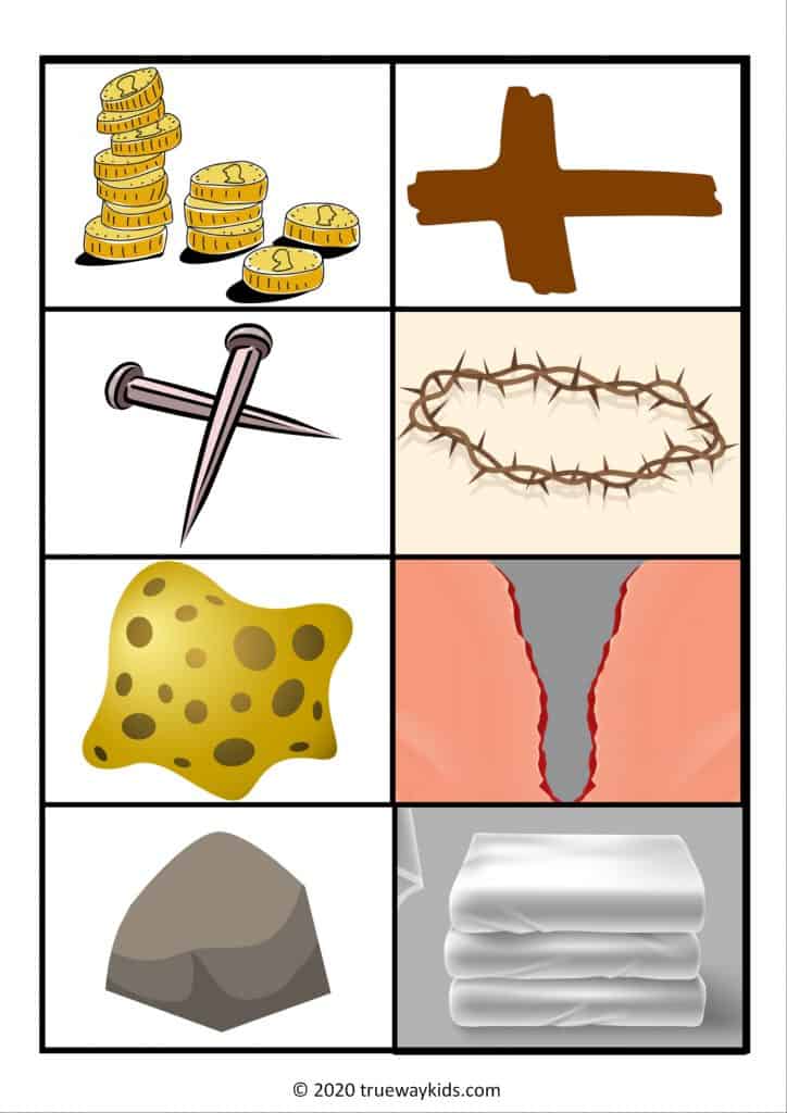왕관 – 자녀들에게 예수님은 왕이시라는 것을 상기시켜 주세요. 그러나 로마인들이 예수님에게 면류관을 올렸을 때, 그들은 그 분을 조롱하고 있었죠. 사람들은 잘 알지 못했기에 예수님을 조롱하고, 그 분에 대해 나쁜 말을 했다는 것을 알려주세요. 자녀들에게 예수님께서 “저들을 사하여 주옵소서 자기들이 하는 것을 알지 못함이니이다” 라고 기도하셨던 것을 가르쳐주세요. 예수님이 진정한 왕이신 것을 사람들에게 알려줄 수 있는 방법을 함께 생각해보세요.