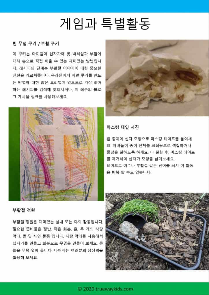 찢긴 헝겊 – 자녀에게 죄가 우리를 하나님으로부터 분리 시킨다는 것을 상기시켜 주세요. 성막 혹은 성전에 관한 지난 수업 내용들을 참고하시고, 하나님과 사람들 사이를 나누는 성소의 휘장이 항상 있었다는 것을 보여주세요. 예수님께서 돌아가셨을 때 성소의 휘장이 위에서 아래까지 찢어졌다는 것에 대해 말해 주세요. 예수님께서 어떻게 우리가 하나님께 돌아오는 길이 되셨는지 나눠보세요.