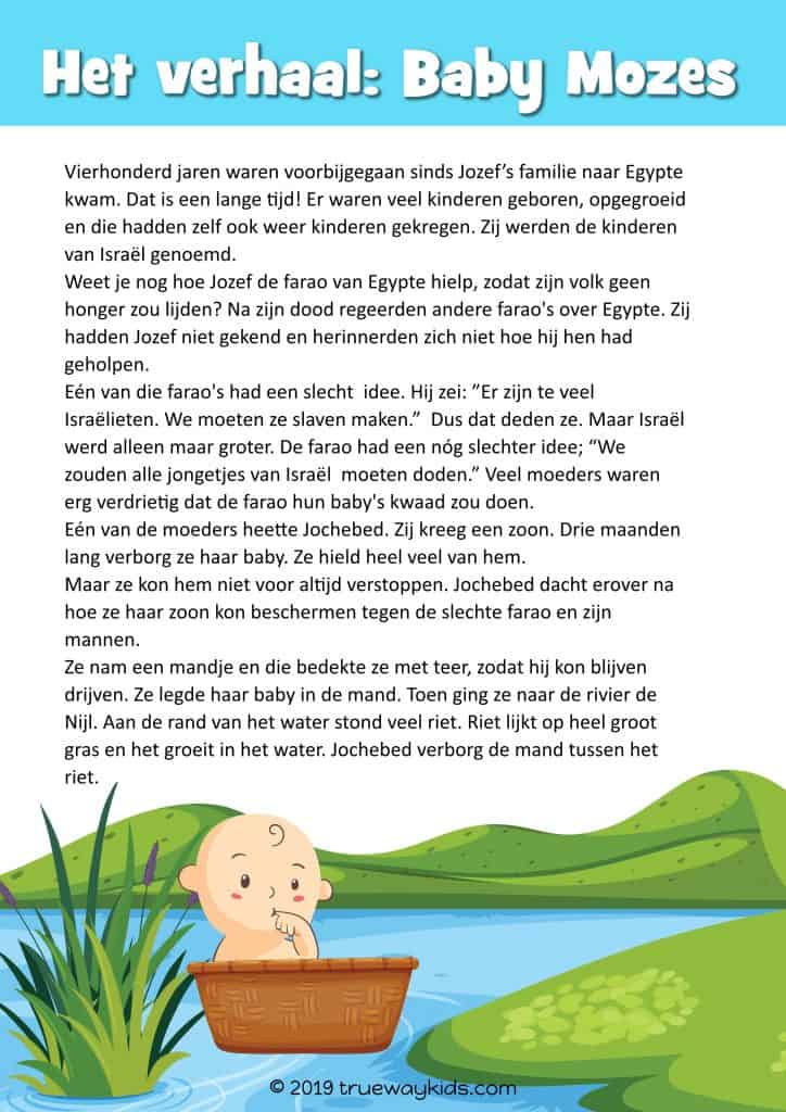 In de les van deze week kijken we naar het verhaal van baby Mozes. Het verhaal kun je vinden in Exodus 2. Het zou geweldig zijn als je dit verhaal kunt vertellen aan de oever van een rivier in de buurt, dit zal je kind helpen om het te visualiseren. Een aantal van de hoofdpunten die we zullen bekijken zijn: