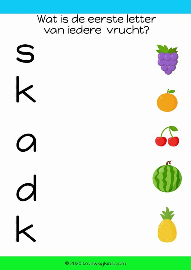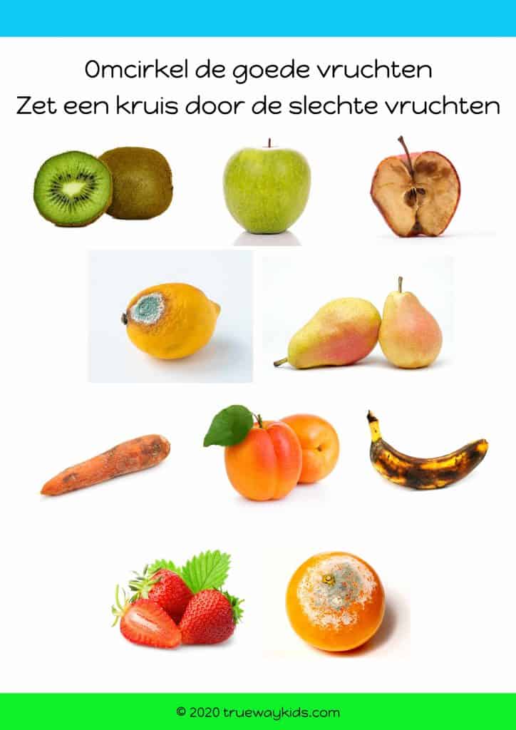 Leg verschillende vruchten op tafel. Het moeten eental bekenden en favoriete vruchten zijn van jullie gezin, maar ook een aantal vreemde, die je kind nog nooit gegeten heeft. Bekijk de buitenkant, en bespreek met je kind de verschillen. Vraag je kind om het fruit in verschillende groepen te verdelen, en daarbij gebruik te maken van de verschillende kenmerken die jullie eerder zagen. Als het kind ervoor kiest om op schil te selecteren, dan zal hij de vruchten groeperen gebaseerd op de dikte van de schil, dun (appels, kersen, perziken) en dik (watermeloen, banaan en ananas). Snij de vruchten open en bekijk de binnenkant. Sorteer opnieuw de vruchten. Pitten of zonder pitten, etc. Laat ook een bekende vrucht zien die beschadigd is. Bespreek hoe je van de buiten of de binnenkant kunt zien of een vrucht beschadigd is of niet. Denk samen na over hoe deze vrucht beschadigd ziu kunnen zijn geraakt. Was het een wormpje, rot of was het gevallen?