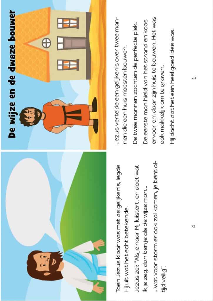 Leg uit dat Jezus deze gelijkenis vertelde, omdat er mensen waren die wel naar Zijn onderwijs luisterden, maar die niet deden wat Hij onderwees. Vraag je kind wat het betekent om Jezus’ woorden in praktijk te brengen. Geef een aantal voorbeelden van momenten waarop jij hen vroeg om jou te gehoorzamen omdat jij van ze houd en omdat jij ze wilt beschermen.