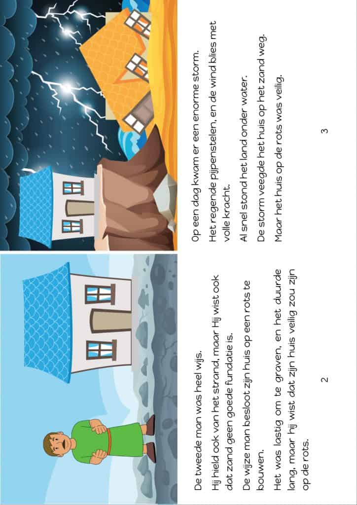 Laat zien dat de storm tegen beide huizen sloeg; van zowel de wijze als de dwaze bouwer. Herinner je kind eraan dat we, zelfs als we op Jezus vertrouwen en we Hem gehoorzamen, dan nog moeilijke tijden mee zullen maken. Maar als we Hem vertrouwen en we gehoorzamen Zijn Woord, dan zijn we altijd veilig bij God en klaar voor de storm.