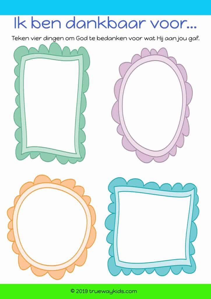 Spreek erover hoe vaak de Israëlieten klaagden. Vraag het kind of zij wel eens ergens over geklaagd hebben. Praat over enkele manieren waarop ze zich kunnen richten op dankbaarheid. Bijvoorbeeld, als ze vaak klagen over de kleur van hun schoenen, denk met ze na over hoe schoenen hun voeten beschermen, ze warm houden, etc. Houd dit leuk door enkele grappige redenen te bedenken om dankbaar te zijn, zoals dat, hoewel broccoli misschien niet hun favoriete groente is, ze dankbaar kunnen zijn dat het tenminste niet hun huid groen kleurt als ze het eten. Je kunt ook een eenvoudige bloem maken voor aan de muur van hun kamer, met redenen om dankbaar te zijn op de blaadjes geschreven. Je kunt een spel spelen waarbij iedere keer dat iemand in de familie ergens over klaagt, iemand anders kan roepen: Wees dankbaar! En de klager moet dan een reden bedenken waarom hij of zij dankbaar kan zijn.