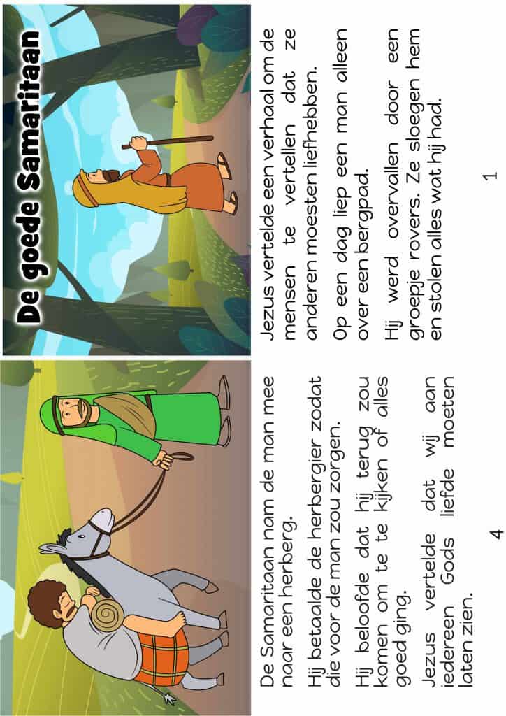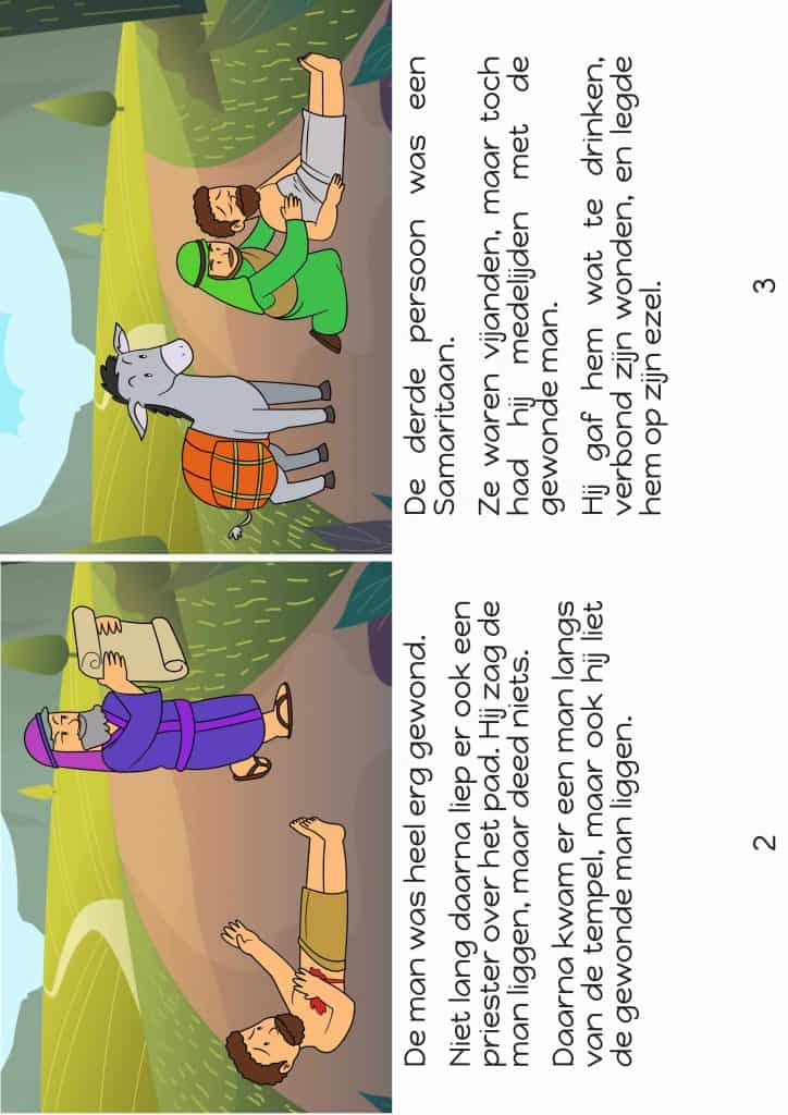 Vertel dat de Samaritaanse man de gewonde man niet alleen hielp, maar dat hij veel verder ging dan wat er van hem verwacht kon worden. Hem verzorgen, hem dragen, voor zijn behandeling betalen, etc. Herinner je kind eraan dat God er van houd als wij meer doen dan wat er van ons gevraagd worden als we Hem dienen.