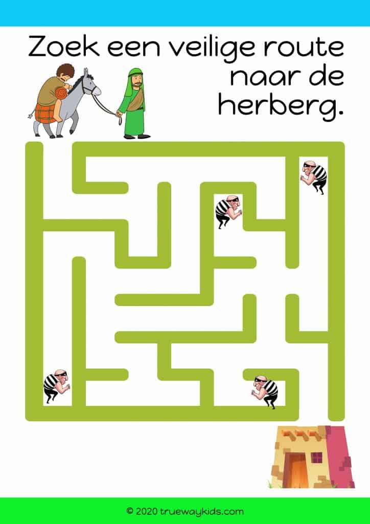 Lees de gelijkenis voor uit de kinderbijbel. Leg uit dat de man probeerde om Jezus in de val te lokken toen hij vroeg: “Wie is mijn naaste?”.