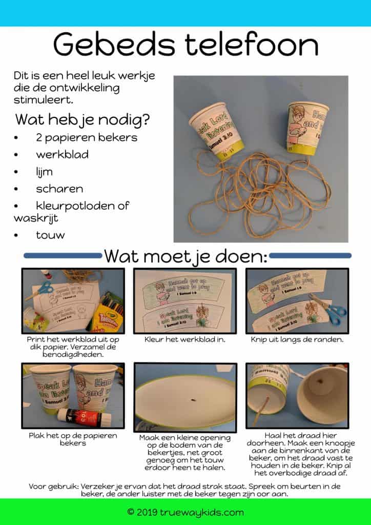 Gebruik een paar piepschuim bekers en een stuk touw om een ’telefoon’ te maken. Speel met je kind en stuur berichten naar elkaar. Help je kind te begrijpen dat gebed niet is als een microfoon, waar we alleen tot God spreken, maar als een telefoon, waar we spreken en luisteren.