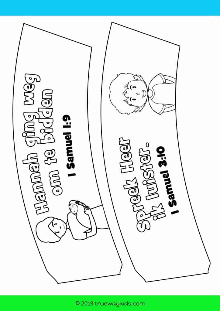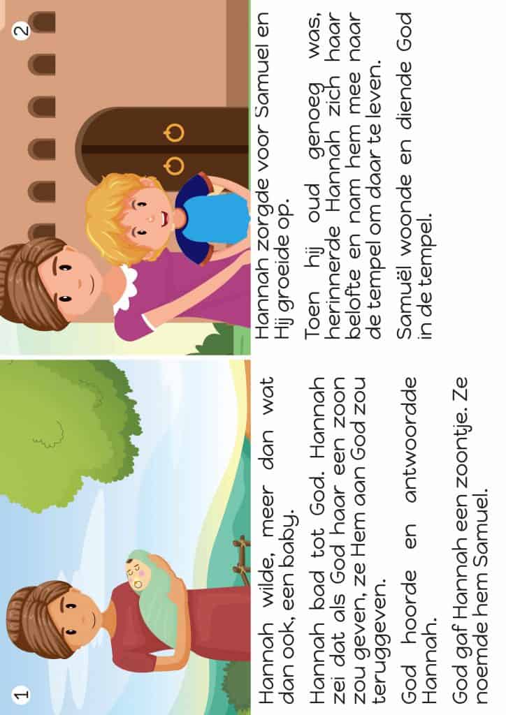 Leg uit dat Hannah een belofte deed aan God. Ze vertelde hem dat als God haar een kind zou geven, ze het kind aan God zou teruggeven. Geef voorbeelden van hoe we soms iets soortgelijks zeggen. Bijvoorbeeld: “Als u me buiten laat spelen, dan ruim ik m’n speelgoed op als ik weer terugkom”. Maar dan vergeten we het, of willen we onze belofte niet nakomen. Hannah hield haar belofte aan God. Praat over dat we geen dingen moeten zeggen die we niet zullen doen.