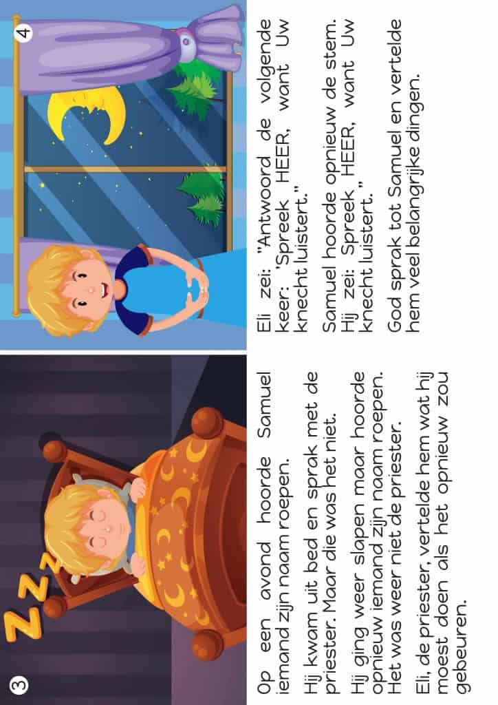 Lees hoe God Samuël riep in 1 Samuël 3: 1-21. Praat over hoe Samuel niet verwachtte dat God tot hem zou spreken en dacht dat het Eli was. Leg je kind uit dat ze heel belangrijk zijn voor God en dat God met ze wil praten. Leg uit dat God niet alleen tot volwassenen spreekt. Herinner je kind eraan dat de Bijbel Gods Woord is en dat Hij altijd tot ons spreekt wanneer we het lezen.