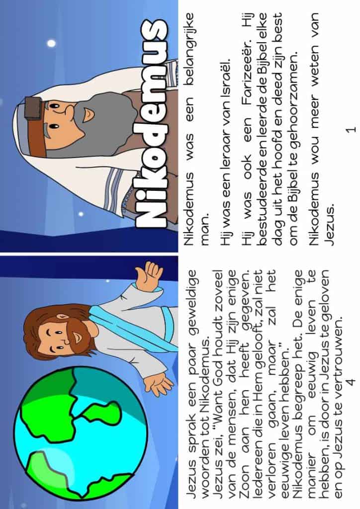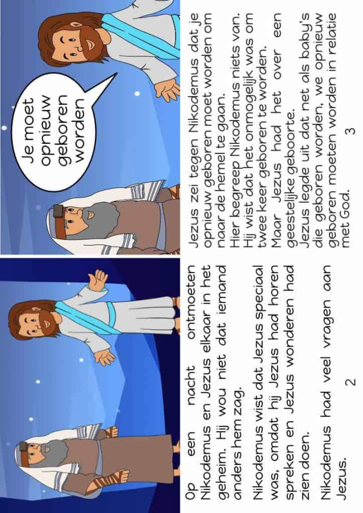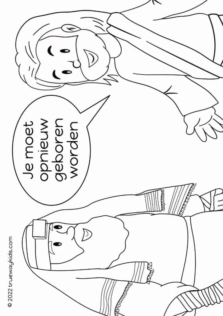 Praat met de kinderen over “vragen”. Sommige vragen zijn makkelijker te beantwoorden dan andere vragen. Wat gaan we eten, is makkelijk te beantwoorden, maar waarom zijn er vragen die moeilijker te beantwoorden zijn. Vertel dat Nikodemus grote vragen had en dat hij daarop antwoorden nodig had. Nikodemus ging naar Jezus om antwoorden te krijgen op zijn vragen. Wij kunnen ook naar Jezus toegaan met onze moeilijke vragen. Soms staat het antwoord in de Bijbel en soms moeten we vertrouwen dat God het antwoord weet en dat Hij alles onder controle heeft.
