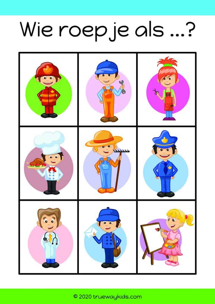 Plaats de kaartjes van de volgende pagina op de tafel. Stel een vraag aan een van de kinderen: “Wie moet ik om hulp vragen als ik ziek ben?” of “Wie moet ik om hulp vragen als ik iets in de brand zie staan?”