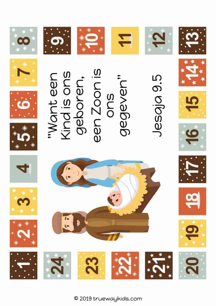 Leg aan je kind uit dat dat de tijd was gekomen voor Jezus om geboren te worden. Bespreek hoe Jozef en Maria niet in Betlehem woonde, en Betlehem was de stad waar volgens de profetieën de messias geboren zou worden. Leg uit dat de Romeinse baas van het land een volkstelling uitriep, en vanwege die volkstelling moesten Jozef en Maria naar Betlehem, precies zoals de profetieën hadden gezegd.