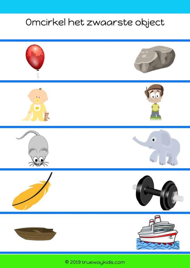 Ga zitten en vraag je kind om de voorwerpen, naar gewicht, op een rij te zetten