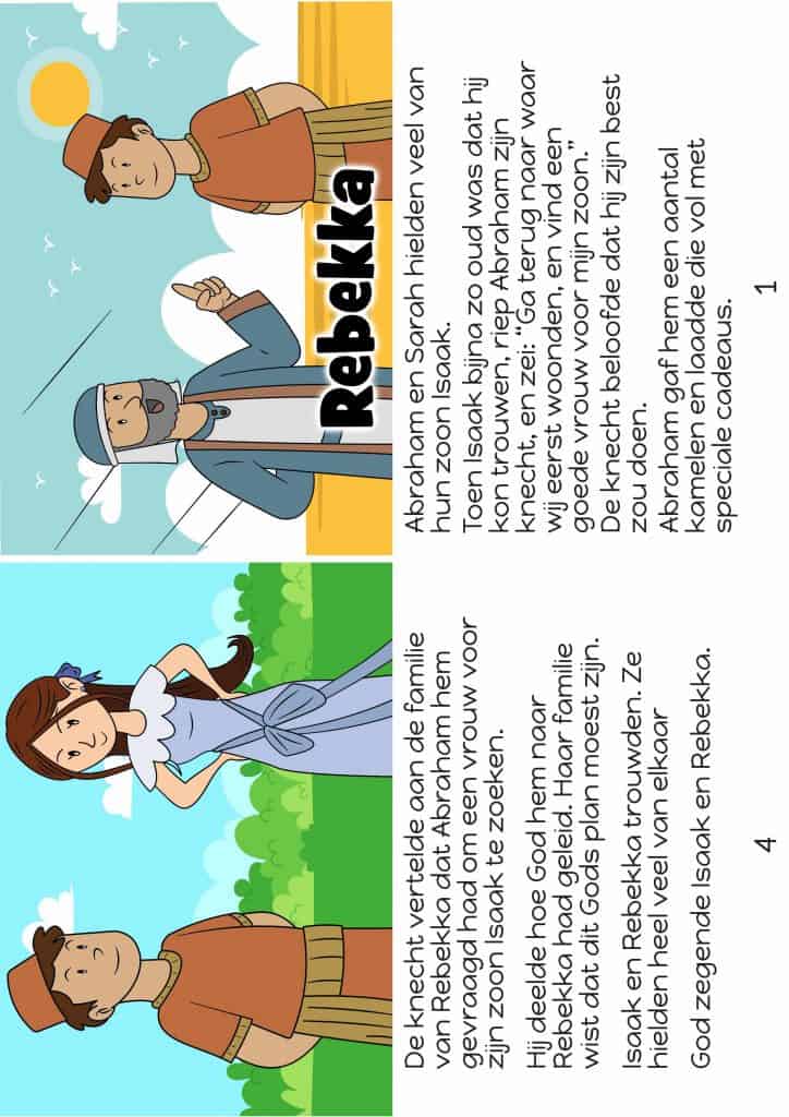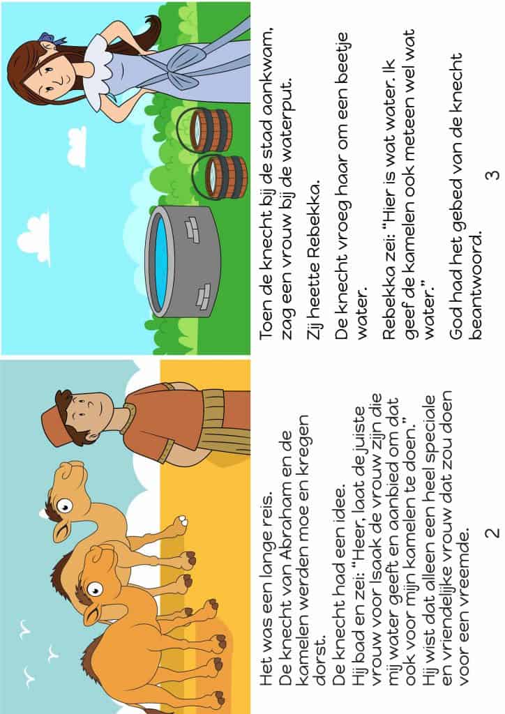 Vertel hoe de knecht, door God, naar Rebekka werd geleid. Rebekka deed niet alleen wat haar verantwoordelijkheid was, maar toen ze zag dat de kamelen dorst hadden haalde ze ook water voor hen. Leg uit hoeveel moeite het gekost moet hebben om zoveel water te verzamelen. Geef een voorbeeld van hoe wij ook goed kunnen doen. Als het kan, kun je een spel spelen waarin je kind water moet verzamelen en dat van de ene naar de andere kant van de ruimte moet brengen.