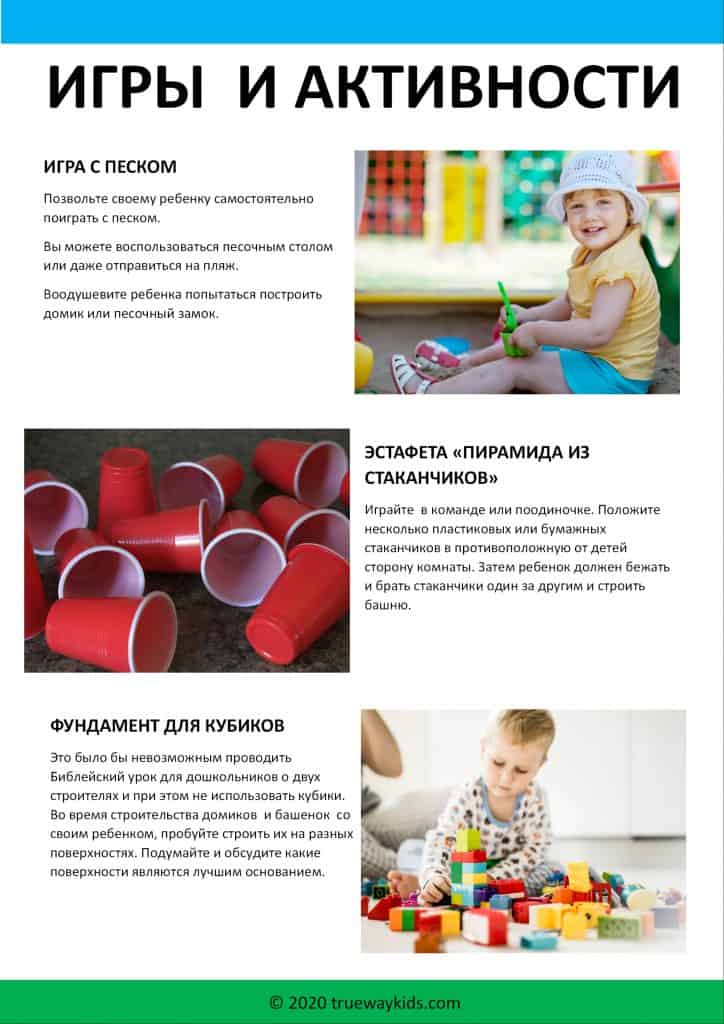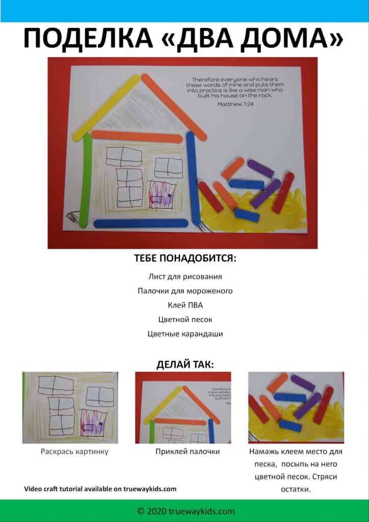 Перечитайте притчу от Матфея 7:24-29 и попросите детей объяснить вам эту историю. Чем отличались эти два дома? Какой дом смог устоять во время шторма?
