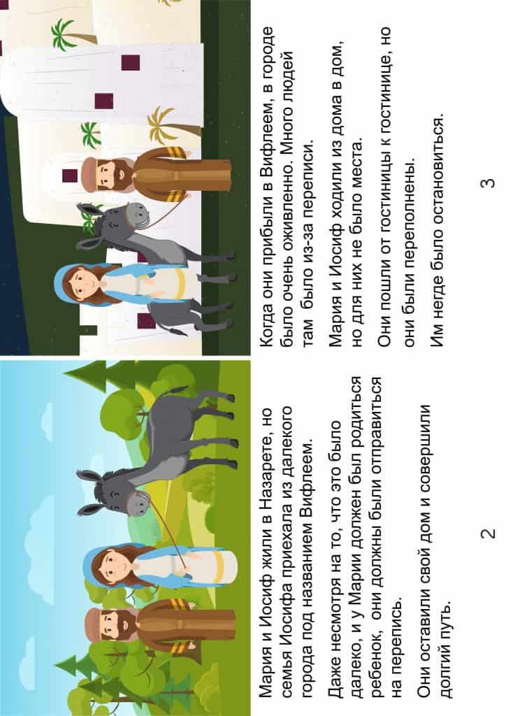 Объясните ребенку, что пришло время для рождения Иисуса. Поговорите о том, как Мария и Иосиф не жили в Вифлееме, где по сказанным пророчествам должен был родиться Иисус. Объясните, что лидер страны объявил перепись населения, и из-за переписи, Мария и Иосиф пошли в Вифлеем, так, как было сказано пророчески.