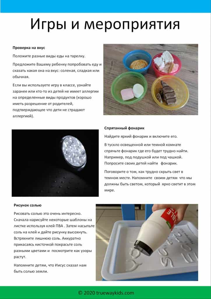 Поговорите о соли и свете. Объясните, что христиане должны быть солью и светом. Приготовьте некоторые продукты, которым нужна соль, такие как картофель или другой овощ. Или вы можете просто приготовить пищу вместе с вашим ребенком и дать ему попробовать еду без соли, а затем попробовать её с солью. Скажите, что соль делает пищу вкуснее. Соль также помогает сохранить пищу.