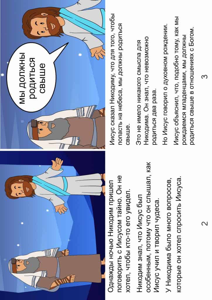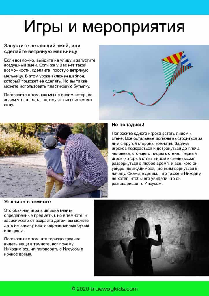 Скажите, что Никодим был смущен разницей между духовными и физическими вещами. Объясните, что духовные вещи нельзя трогать, как физические вещи. Покажите, что руку вашего ребенка можно потрогать, но его душу потрогать нельзя. Вы можете продолжать говорить о том, что некоторые вещи мы можем видеть, а другие не видим. Попросите ребенка определить какой это объект (видимый или нет), приводя разные примеры. Обнимите своего ребенка, и скажите что объятия являются физическими (мы можем видеть их), но они также показывают что мы любим их.