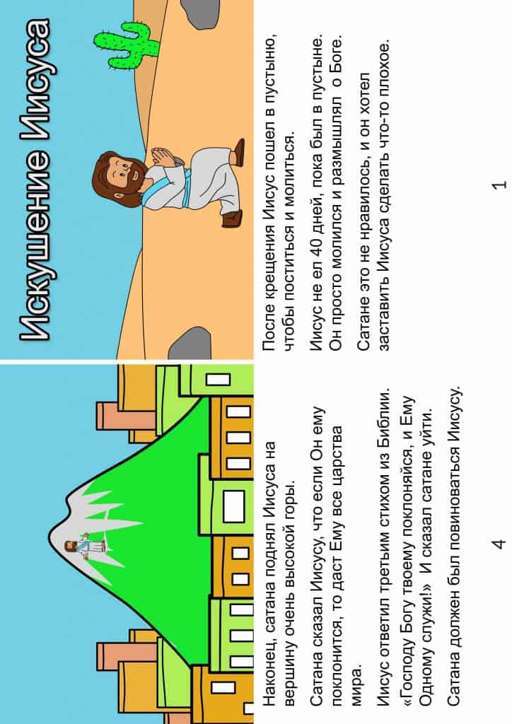Поговорите о том, как сатана трижды искушал Иисуса, но Иисус противостал его искушениям. Спросите, что сделал Иисус, чтобы противостоять искушению? При необходимости помогите ребенку понять, что каждый раз Иисус цитировал Писание, чтобы противостать искушению. Отметьте, что Иисус никогда не грешил.