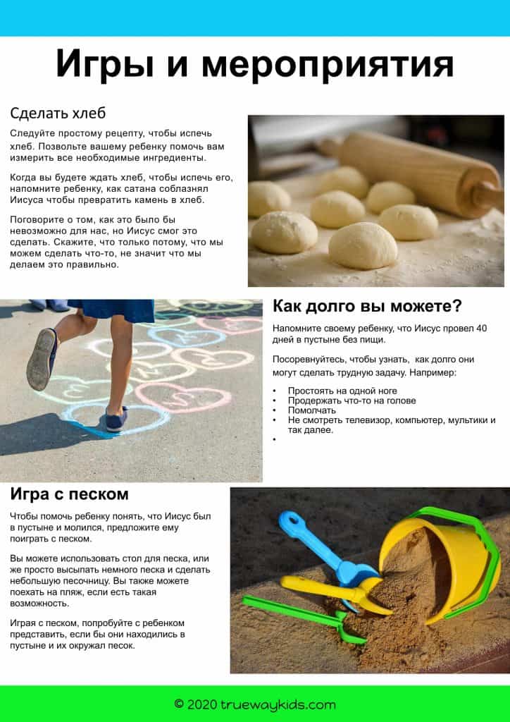 Поговорите с ребенком об искушении. Скажите, что искушение – это желание сделать что-то не так. Спросите ребенка, не поддавался ли он искушению. Возможно, он что-то сломал и солгал, чтобы не попасть в беду? Может, он украл сладости. Спросите ребенка, помнит ли он, что он чувствовал, прежде чем совершить этот грех. Отметьте, что иногда искушению труднее устоять. Спросите ребенка, когда было бы труднее противостать краже сладкого: после того как он съел торт или когда он был очень голоден. Вы можете продолжать список случаев, когда было бы легче или труднее противостоять искушению. Затем скажите, что Иисус не ел в течение сорока дней. Спросите ребенка, испытывал ли он чувство голода когда-нибудь. Скажите, что Иисус был очень голоден, и сатана предложил Ему пищу, но Иисус сказал нет. Он не поддался искушению.