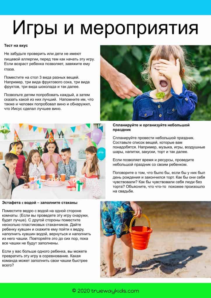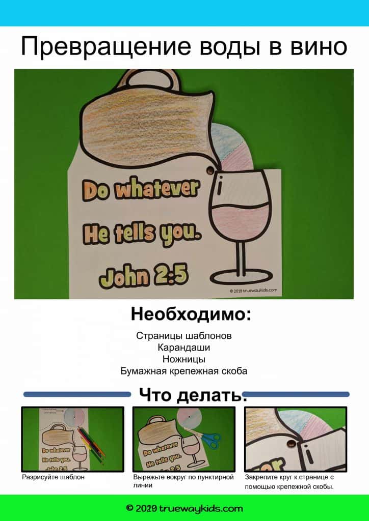 Возьмите чистый кувшин и заполните его водой. Спросите ребенка, как он думает, сможете ли вы превратить воду в сок? Вы можете превратить это в веселую игру, и попросить ребенка чтобы он сказал воде в кувшине превратиться в сок. Затем, возьмите порошок сока, добавьте в кувшин и перемешайте. Поговорите о том, как вы делаете сок с помощью порошка сока. Спросите ребенка, является ли это чудом. Скажите, что это не так. Затем спросите, было ли это чудо, когда Иисус превратил воду в вино? Отметьте, что Иисус не использовал порошок сока или что-нибудь еще, но Он просто сотворил вино.
