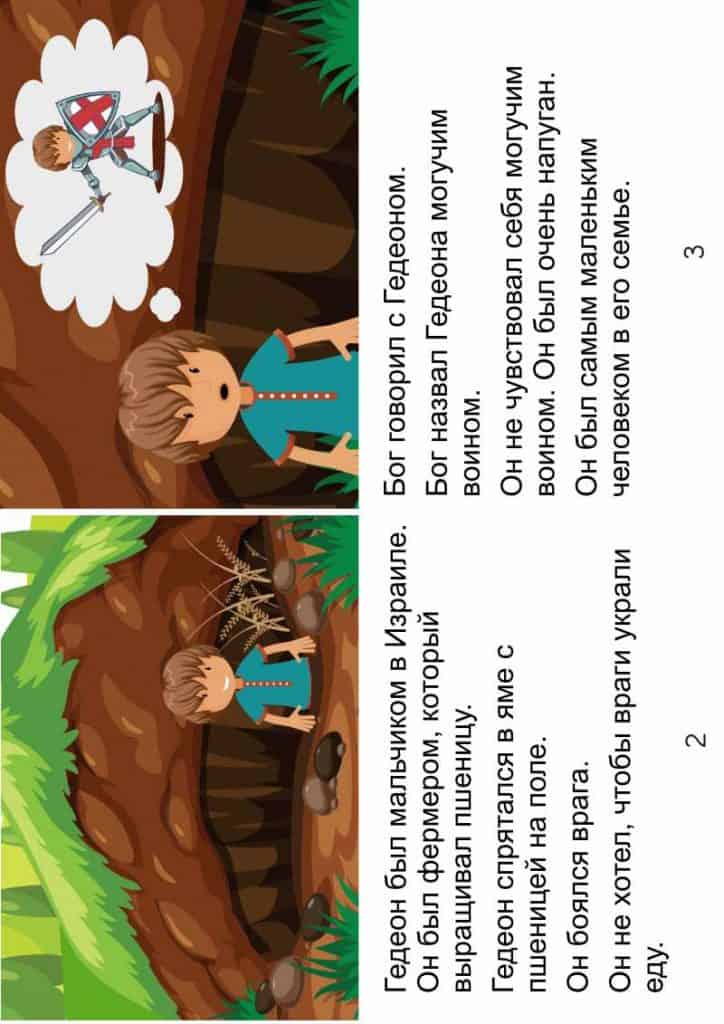 Поговорите о том как Гедеон боялся выполнять задачи, которые Бог дал ему. Подумайте о некоторых случаях когда вы и ваш ребенок испытали страх. Объясните, что Бог дает нам силу, необходимую для выполнения задач, которые Он просит нас сделать. Чтобы проиллюстрировать, высыпьте кучу песка на пол в вашем доме. Попросите ребенка очистить песок только пальцами. Когда ребенок потерпит неудачу или разочаруется, возьмите пылесос и соберите песок. Объясните, что своими силами ваш ребенок не смог бы выполнить эту задачу, точно так же, как Гедеон не смог бы сделать то, о чем Бог просил его без Божьей помощи. Поговорите о том, как Бог дает нам возможность выполнять задачи, которые мы должны сделать так же, как вы предоставили вашему ребенку пылесос (или метлу и пылесос). Запомните Судей 6:12 «Ангел Господень явился Гедеону и сказал: ‘Господь с тобою, муж сильный!'» Напомните ребенку процитировать этот стих, когда он боится (можно сократить стих до второй половины стиха).
