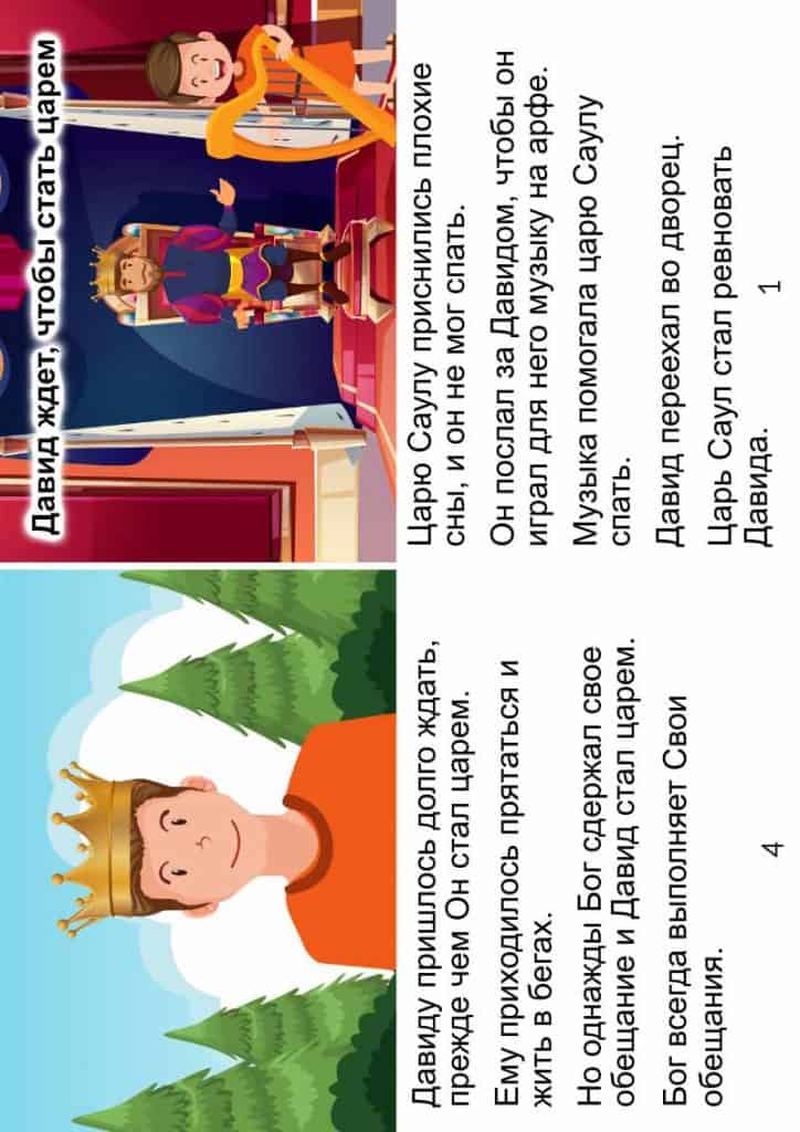 Поговорите о том, как Давид доверял Богу, даже когда все казалось плохим. Он знал, что Бог сдержит свое обещание и что однажды он станет царем. Объясните, что Бог всегда знает лучше. Возьмите тарелку с красивым дизайном. Держите её над головой ребенка, чтобы он мог видеть только дно. Спросите ребенка, выглядит ли тарелка красиво. Затем опустите тарелку, чтобы ребенок мог видеть красивый дизайн. Поговорите о том, что Бог всегда может видеть общую картину, даже если мы не можем.