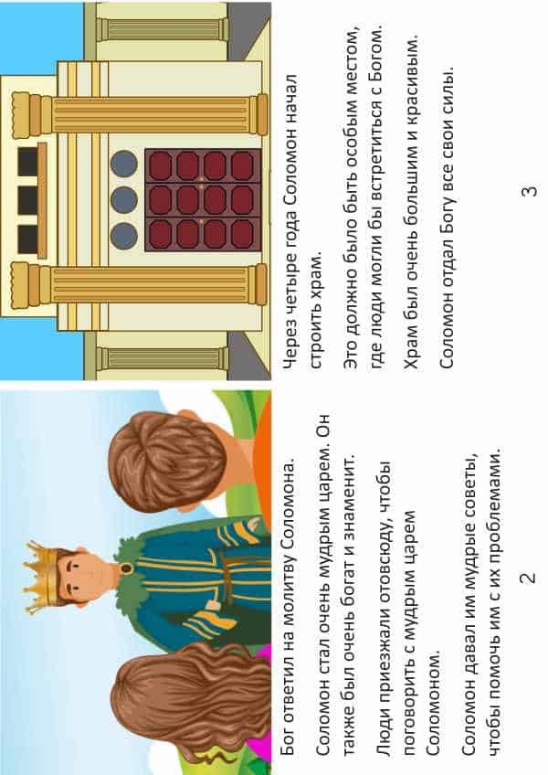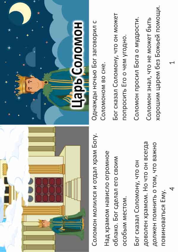 Объясните, что Соломон был сыном Давида и он стал царем. Прочитайте 1 Царств 3:5-14 вместе со своим ребенком и объясните, как Бог сказал Соломону: «Проси все, что ты хочешь, чтобы Я дал тебе». Напомните, что Соломон просил не денег, здоровья, славы, а мудрости. Соломон не просил эгоистичных вещей, но вместо этого он просил мудрости, чтобы быть хорошим царем для народа. Бог удовлетворил его просьбу и благословил его многими другими способами.