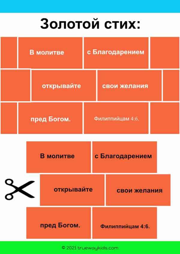 Расскажите о том, как Неемия молился и просил Бога помочь ему. Прочитайте вместе Филиппийцам 4:6 (вы также можете выучить этот стих). Поговорите о том, что мы не должны беспокоиться, а должны молиться. Скажите, что в этом стихе также говорится о том, чтобы благодарить Бога. Составьте список некоторых молитвенных просьб, которые у вас могут быть, и некоторых благодарностей. Если ребенок слишком мал, чтобы читать или писать, вы можете создать рисунки вместе, чтобы представить ваши молитвы и благодарности.