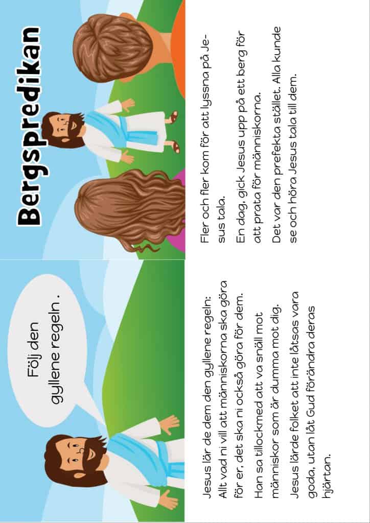 Prata om hur Jesus talade om att vi ska behandla andra som vi själva vill bli behandlade. Fråga barnen om de blivit behandlade på ett sätt de inte gillade. Kommer barnen själva ihåg om de behandlat en kompis på ett sätt de inte velat bli behandlade. Påpeka att vi alltid ska fråga oss själva ”vill jag bli behandlad så här?” Följ en läsplan för att läsa delar av bergspredikan under veckan. Har du en grupp, skicka en plan hem med barnen. Påminn att det är viktigt att läsa från bibeln med barnen.