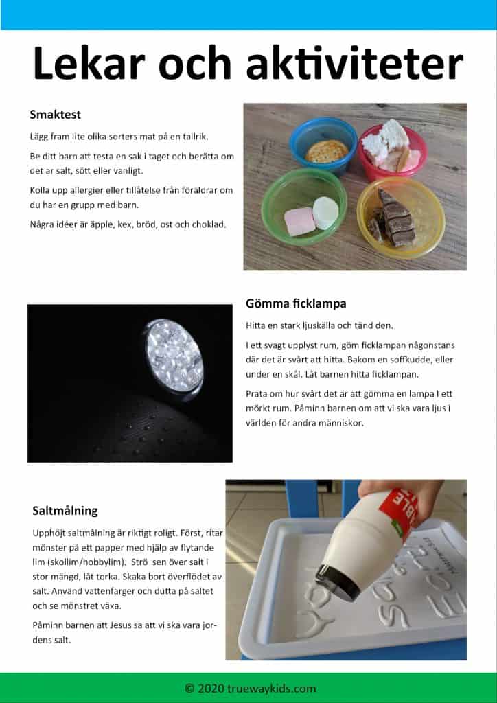 Berätta om salt och ljus. Förklara att kristna ska vara salt och ljus. Förbered mat som behöver salt som potatis eller någon grönsak. Eller låt barnen vara med när du lagar mat och låt dem testa maten utan salt, och sen med salt. Påpeka att det är saltet som gör att maten smakar bättre. Salt kan också bevara mat.