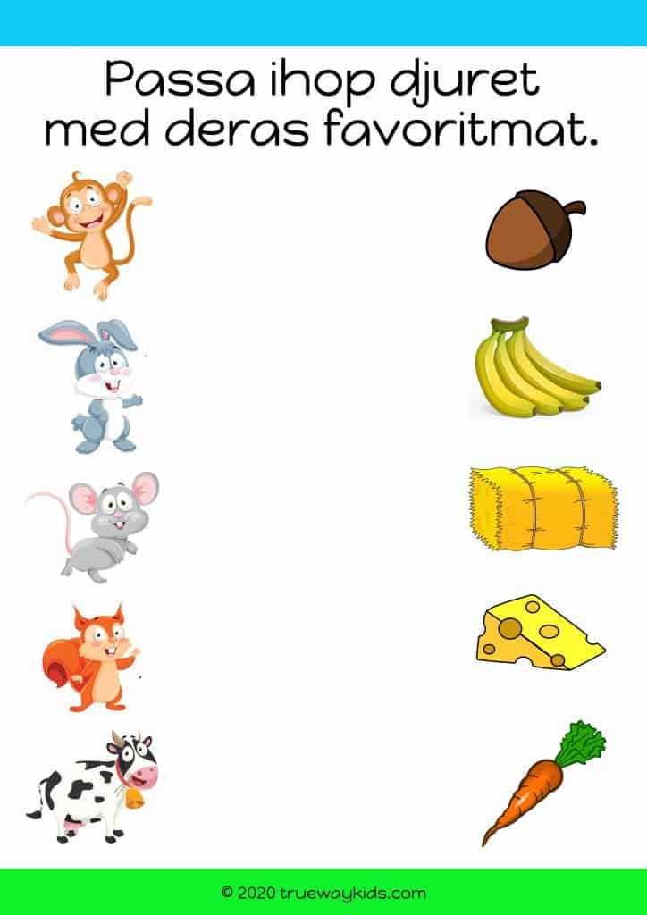 Använd arbetsbladet med djuren och olika mat. Förklara varje gång barnet valt mat att djuren väljer det som är naturligt för dem att äta.