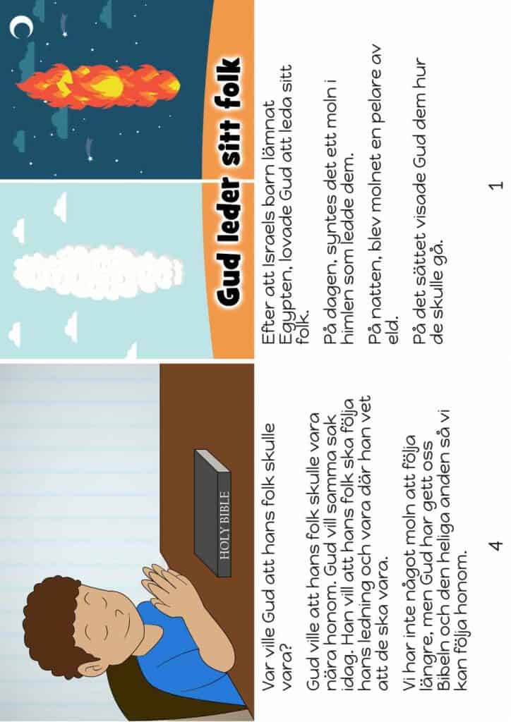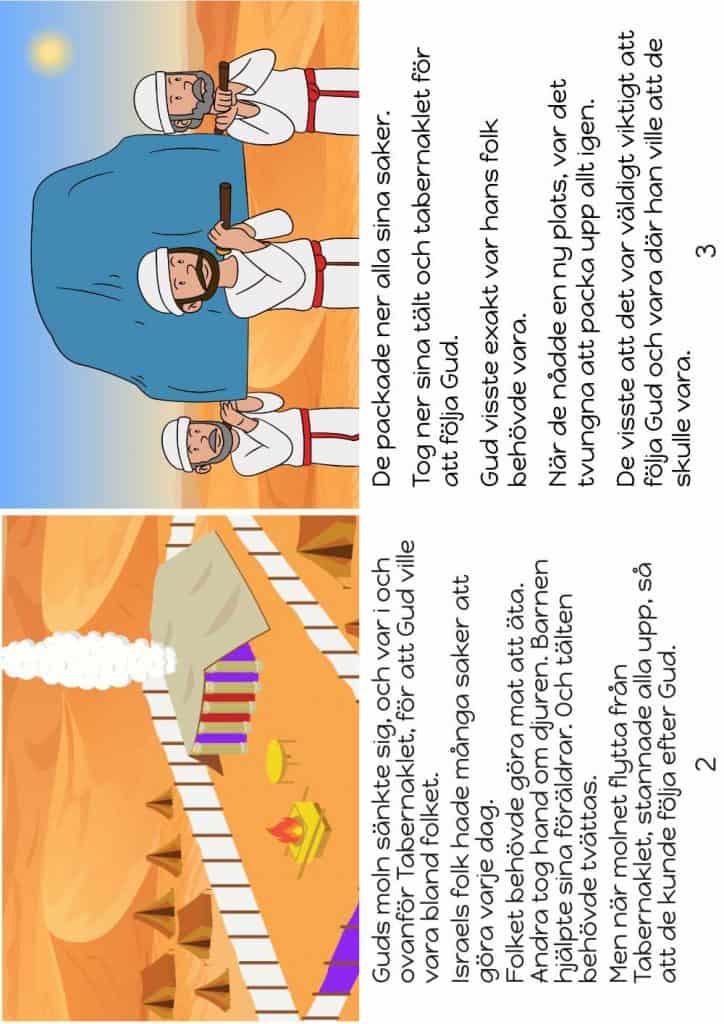 Lek en lek med dina barn för att demonstrera hur Gud leder sitt folk. Gör ett enkelt tält som en spelpjäs. Ta fram något till dig själv för att imitera ett moln. Spelpjäserna kan vara vad som helst som en kudde som moln och en enkel ritning som symboliserar tältet. Spelets gång. Höj kudden (beroende på barnets ålder kan du säga, ”Molnet har lyft”) Nu ska barnen börja att flytta sitt tält. När du sänker molnet, ska barnet stoppa. Leken är roligare om det är åtminstone två spelare med. Du kan också göra det svårare genom att ge ditt barn en uppgift. (som att bygga ett torn av klossar) så de måste fokusera på att dela uppmärksamheten mellan titta på molnet och göra sin uppgift. Fundera med barnet kring hur vi behöver gör det jobb Gud ger till oss på jorden utan att tappa fokus på honom.