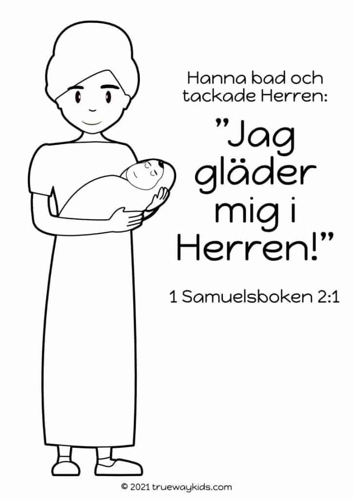 Förklara att Hanna gav Gud ett löfte. Hon lovade Gud att om Han ger henne ett barn, kommer hon att ge barnet tillbaka till Honom. Ge några exempel på liknande saker vi kan säger. T.ex. ”Om du läser en bok för mig nu, lovar jag att städa upp mina leksaker efteråt” eller ”Om du slutar bråka med din lillasyster, får du titta på TV efter badet.” Men ibland glömmer vi vad vi lovat, eller så vill vi inte göra det vi hade lovat. Hanna höll sitt löfte till Gud. Prata om hur viktigt det är att göra det vi lovat och att inte lova något vi inte vill eller kommer att göra.