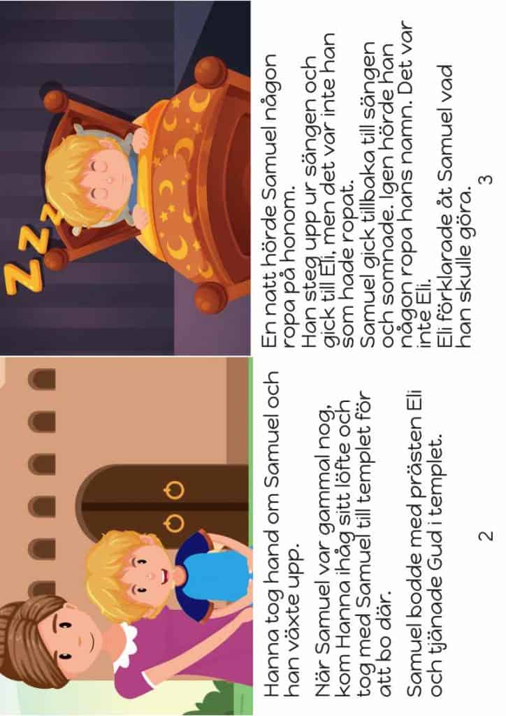 Läs om hur Gud kallade Samuel i 1 Sam. 3:1–21. Påpeka hur Samuel inte hade förväntat sig att Gud skulle tala till honom, utan han trodde det var Eli. Förklara åt barnet att hen är mycket viktig för Gud och att Han vill tala till hen. Gud talar inte bara till vuxna. Påminn barnet om att bibeln är Guds ord och att Han alltid talar till oss då vi läser den.