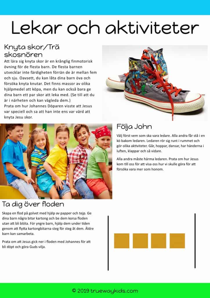 Prata om att Jesus inte behövde räddning eftersom han var syndfri, men han valde ändå att döpa sig för att vara ett exempel, lyd Gud och gör rätt. Fråga barnen vad ett exempel är. Förklara att ett gott exempel är någon som man ska imitera. Lek Följa John. Turas om med dina barn. Förklara att precis som ni i leken härmar varandra, så ger Jesus oss ett exempel på hur vi kan härma honom och lära oss att göra det rätta.