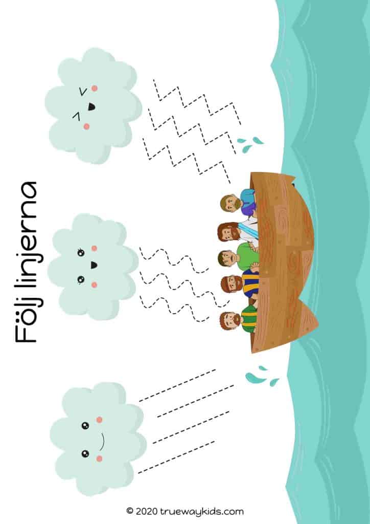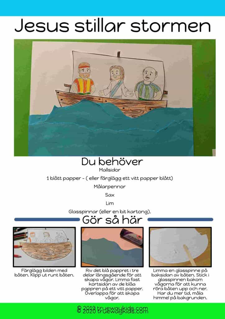 Prata om varför lärjungarna var i båten. Jesus sa åt dem att åka över till andra sidan sjön. Förklara för dina barn att ibland hamnar vi i svåra situationer för att vi är olydiga. Men i den här berättelsen, hamnar lärjungarna i det stormiga havet för att de gjorde som Jesus sa. Påminn dina barn att även om du följer Jesus kommer det inta alltid att vara lätt, men han kommer alltid att vara med dem.