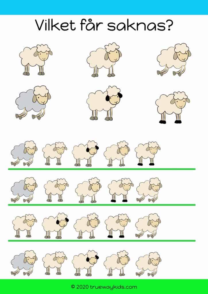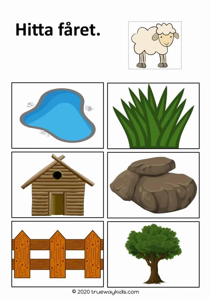 Skriv ut bilderna i materialet. Klipp ut och placera bilderna med bilden uppåt på ett bord, en gömmer fåret under en bild och nu får spelarna i tur och ordning gissa vart fåret är. Den första spelaren som hittar fåret får gömma nästa gång.