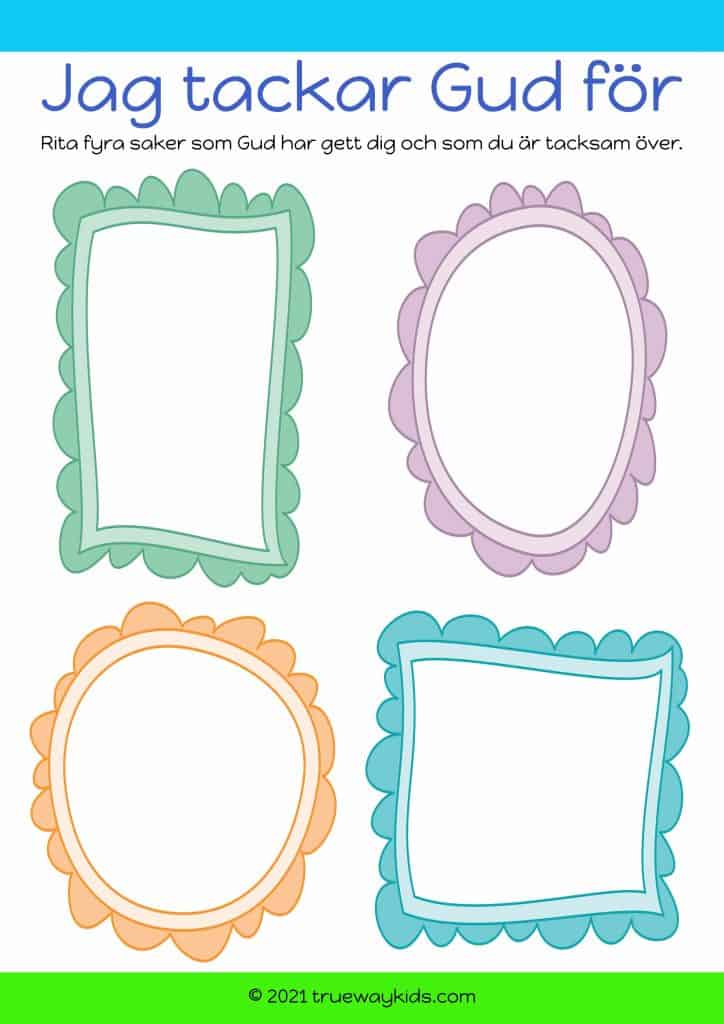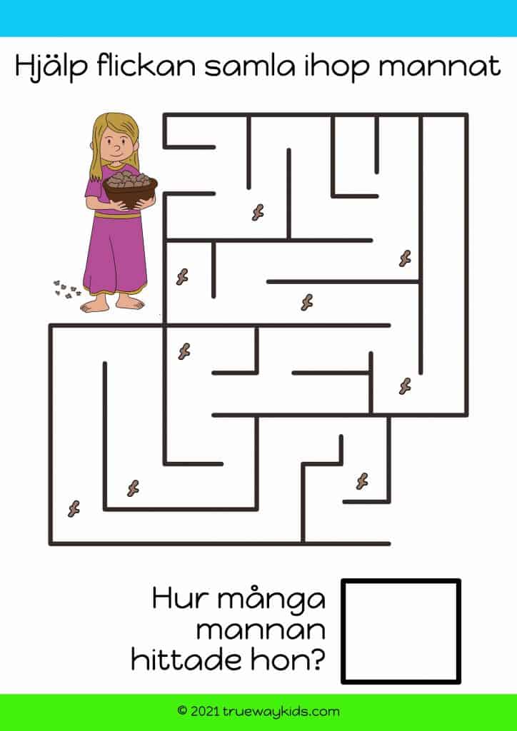 Berätta om hur mycket Israeliterna klagade och knorrade. Fråga barnet om de har klagat någongång. Fundera tillsammans på olika sätt som vi kan fokusera på taksamhet istället för att klaga. Om t.ex. någon klagar på att det är fel färg på skorna, kan hen tänka att skorna skyddar fötterna, håller dem varma och torra etc. Försök att ha roligt genom att föreslå lite knasiga saker att vara tacksamma för. T.ex. ”Broccoli är inte min favoritgrönsak, men jag är tacksam att jag inte blir grön av att äta det”. Du kan göra en blomma på väggen och skriva saker att vara tacksam för på kronbladen. Ni kan leka en lek så att varje gång någon i familjen börja klaga på något, skriker de andra ”TACKSAMHET” och den som har klagat måste hitta på en orsak att vara tacksam.