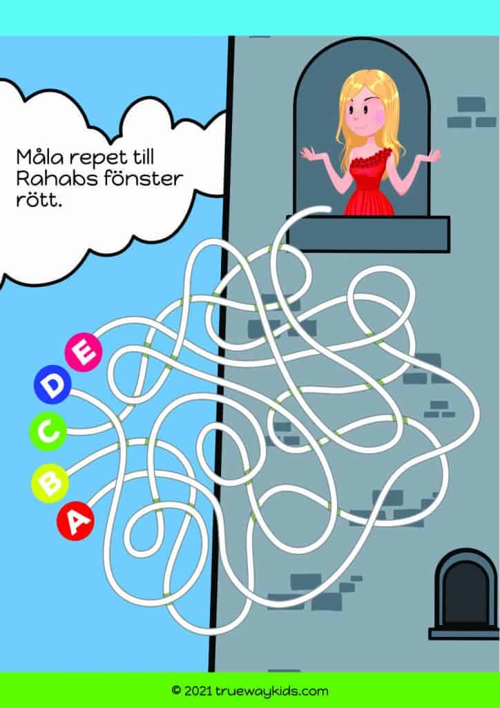 Fråga om de kommer ihåg vilken färg det var på snöret som Rahab hängde i sitt fönster. Bygg en stadsmur av klossar och häng snören i olika färger från muren. Fråga vilket fönster som är Rahabs. Fundera tillsammans att röd också är färgen av Jesu blod som räddar oss från våra synder.