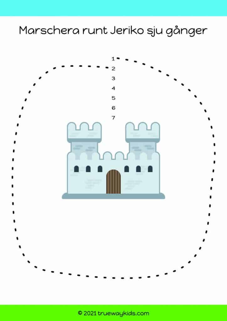 Nu är det er tur att marschera. Använd muren från illustrationen med snören ovan och gå runt muren av klossar. Om det är en liten mur kan ni sätta den på ett bord och gå runt bordet istället. Räkna med barnen för varje varv. På det sjunde varvet, ropa högt och gör trumpetljud. Slå omkull muren.